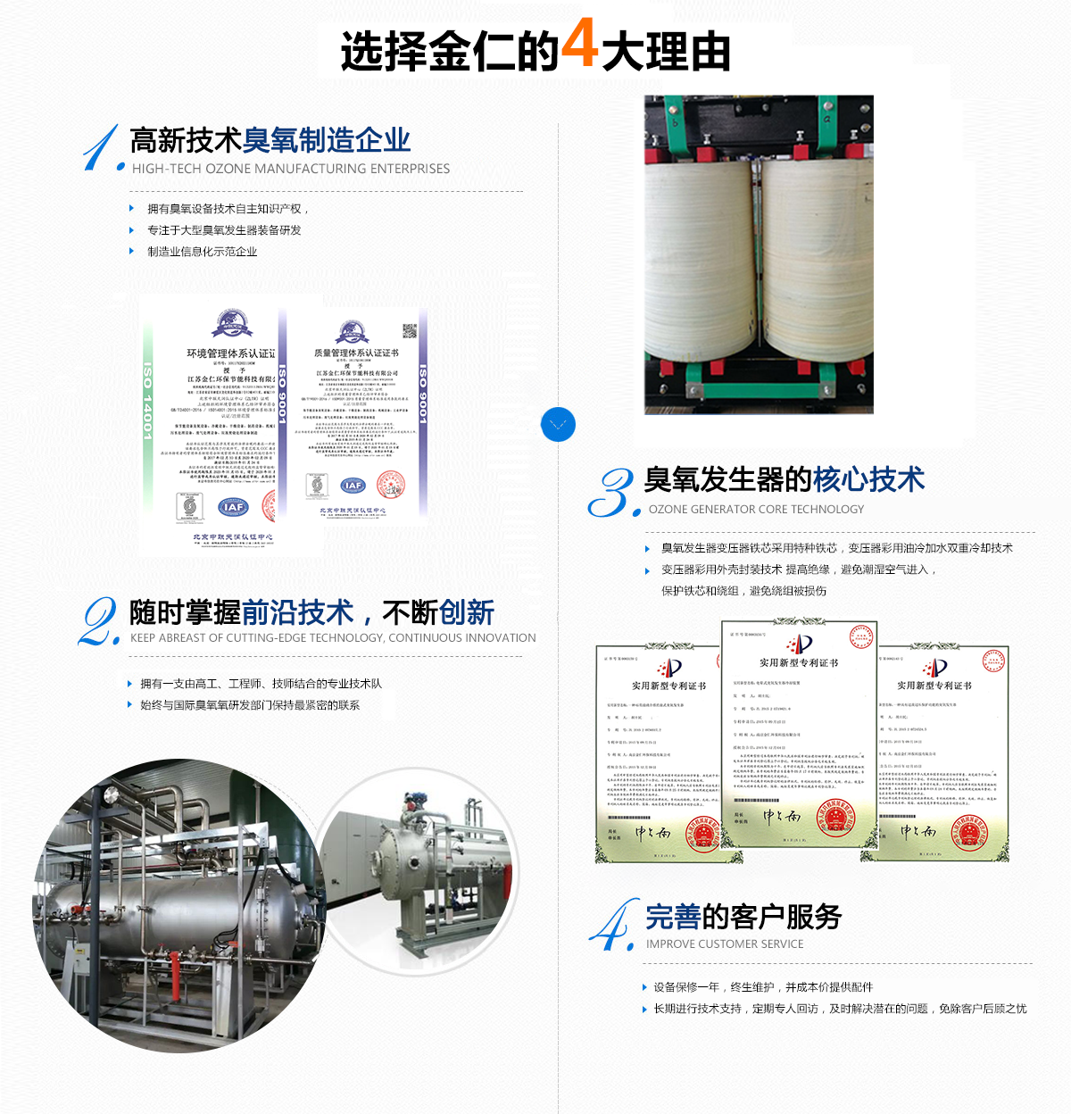 ABOUT US江蘇金仁環保節能科技有限公司主營臭氧發生器、水冷式臭氧發生器、水冷式臭氧消毒劑等眾多產品。